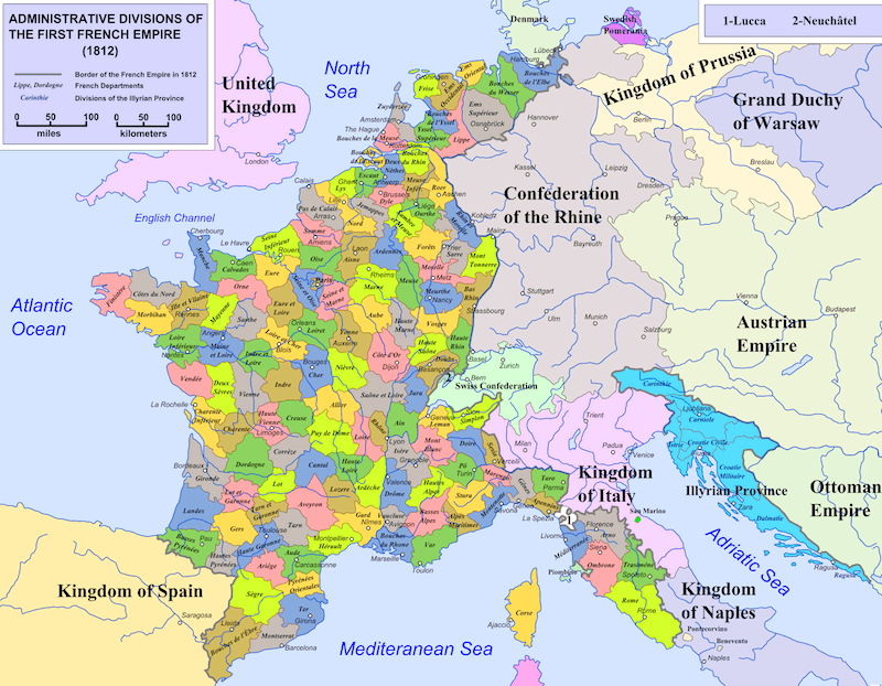 Here's a snapshot of what France looked like in 1812, under Napoleon (courtesy cartesfrance.fr )We won't get into sorting every Louis from every Charles or Francis just yet – that's too complicated right now, especially since French royalty wasn't particularly fertile. Often, monarchs had to look well beyond their immediate families for successors, which makes French royal history dizzying to follow.