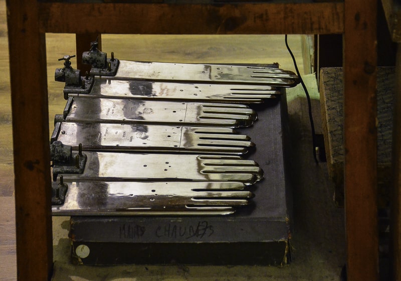 The famous 'iron hands' which allow cutting of up to ten pairs of gloves at a time - this local invention revolutionized Grenoble's glove-making industry